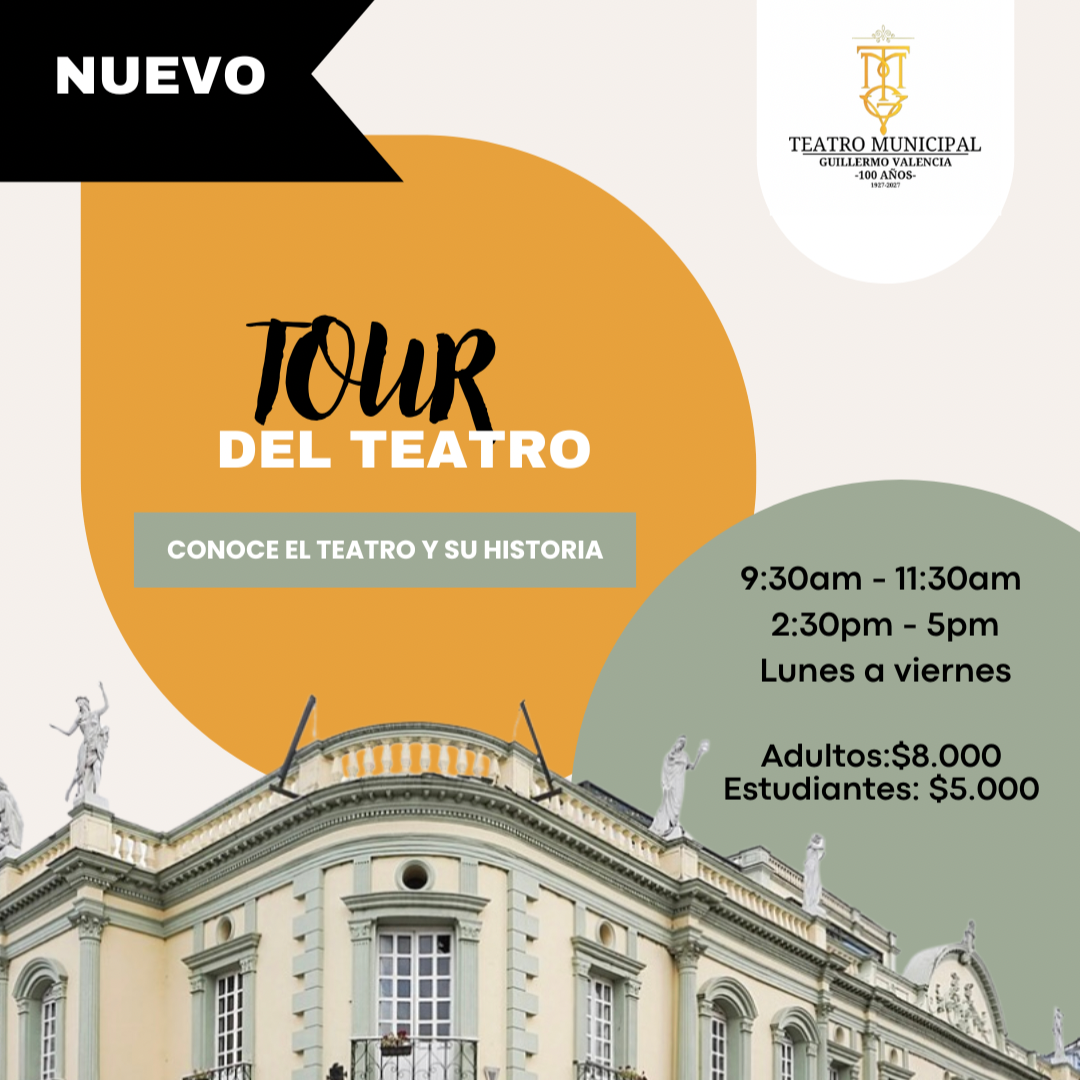EL TEATRO GUILLERMO VALENCIA, te invita a explorar su historia y arquitectura en un recorrido especial disponible de lunes a viernes, en dos horarios: 9:30 a.m. a 11:30 a.m. y 2:30 p.m. a 5:00 p.m. Tarifas: $8.000 para adultos y $5.000 para estudiantes. Incluye visita a los espacios internos del teatro y relato histórico. Reservas al 310 870 7348 o en @teatro.guillermovalencia