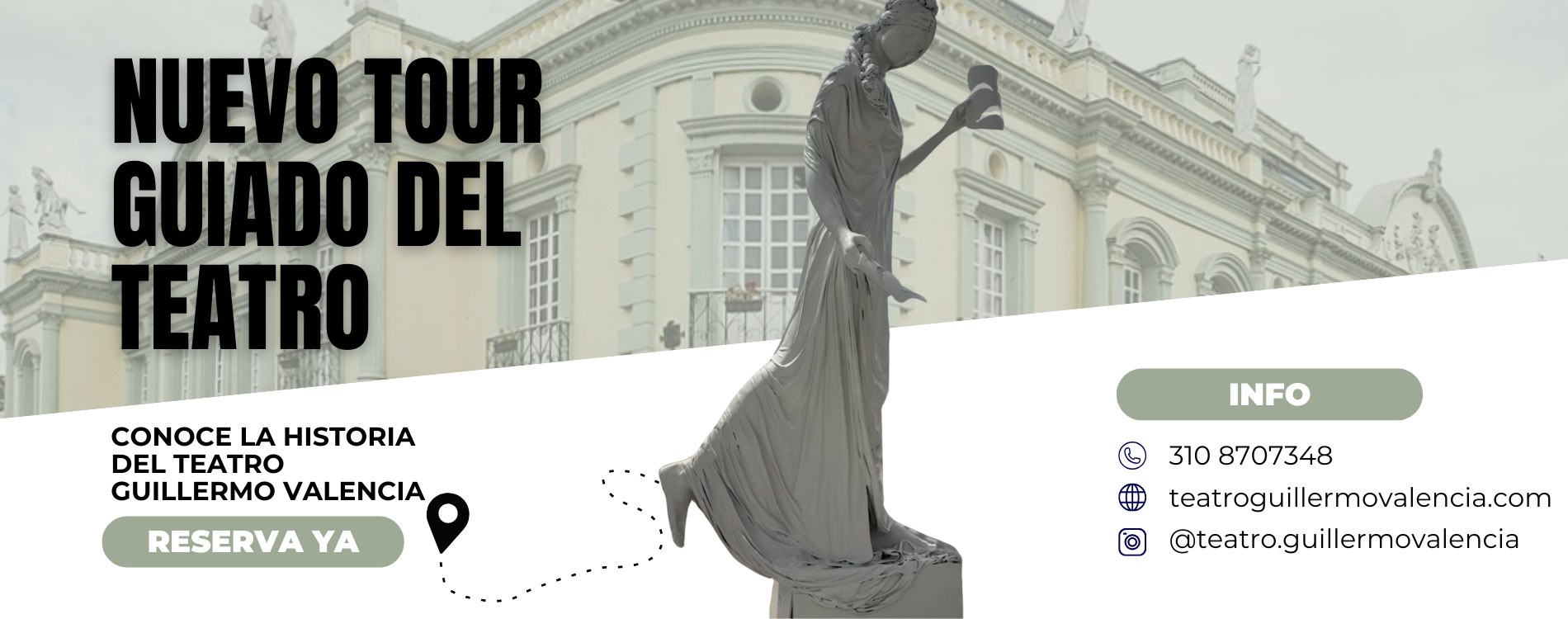 EL TEATRO GUILLERMO VALENCIA, te invita a explorar su historia y arquitectura en un recorrido especial disponible de lunes a viernes, en dos horarios: 9:30 a.m. a 11:30 a.m. y 2:30 p.m. a 5:00 p.m. Tarifas: $8.000 para adultos y $5.000 para estudiantes. Incluye visita a los espacios internos del teatro y relato histórico. Reservas al 310 870 7348 o en @teatro.guillermovalencia